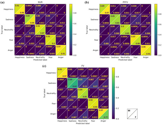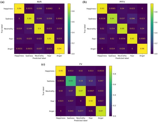 In conjunction with the previous analysis of the accuracy variation across expressions, we present the confusion matrices illustrating the distribution of emotional judgments in Figure 3. Each matrix corresponds to a different experimental condition: (a) NVR, (b) PFFV, and (c) FV. Within each matrix, rows represent the expected, or “correct”, emotional class, while columns correspond to the predicted emotion (judgment). The values in each cell indicate the proportion of each judgment, represented as a value between 0 and 1, where the sum of all judgments in a row equals 1.