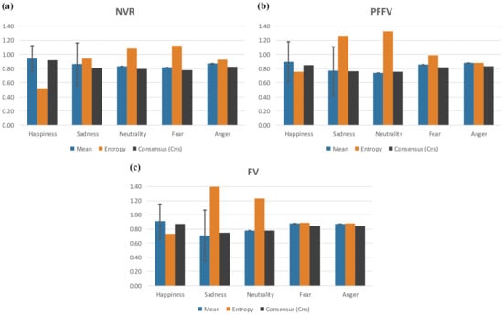The comprehensive results of the analysis can be observed in Figure 4, where the mean, entropy, and Cns measures are plotted for better visualization. These outcomes reveal that the happiness expression presented the highest Cns for all experimental conditions, with values of 0.91, 0.85, and 0.87 for NVR, PFFV, and FV, respectively, indicating the greatest certainty in decision-making for this expression. Additionally, as expected, it exhibited the lowest entropy for all conditions, with the values of 0.51, 0.75, and 0.72, respectively.