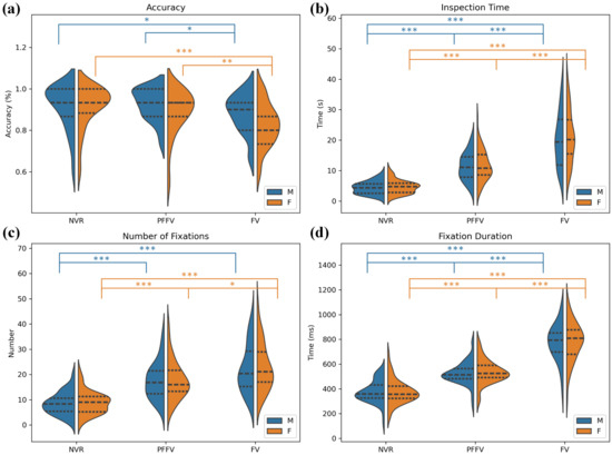 Figure 5 summarizes the overall analysis for the male and female facial genders by experimental condition. It presents split violin plots, where the blue violin represents the male gender and the orange represents the female gender, for the NVR, PFFV, and FV groups, depicting various calculated measures: (a) accuracy, (b) inspection time, (c) number of fixations, and (d) fixation duration. The inner lines indicate the median with a bold dotted line, and the interquartile range is highlighted by the other two dotted lines. The filled areas represent the distribution density of the data. Statistical significance is denoted by “*” symbols, following the same color scheme used for the violins.