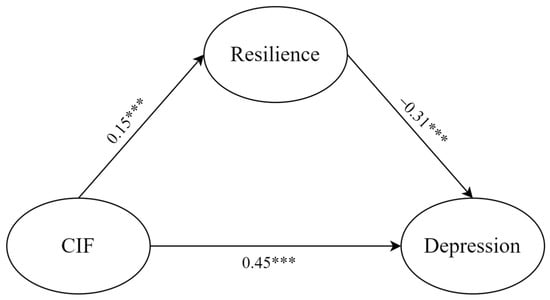 The mediating effect of resilience in the relationship between COVID-19 information FOMO and depression. CIF: COVID-19 information FOMO. *** p < 0.001.