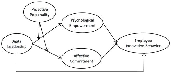 Innovation has been seen as a key way for firms to cope with complex and ever-changing environments and to ensure sustainable competitive advantage [1]. In the current context of digital transformation, innovation is more important for firms than ever before [2]. Consequently, as the cornerstone of organizational innovation, employee innovative behavior plays an increasingly important role in helping firms cope with the increased pressure for innovation brought about by digitalization [3]. Thus, how to stimulate employee innovative behavior has become more and more important and urgent in the digital era [4]. Among a wide range of external factors, leadership has always been considered a key antecedent influencing employee innovative behavior. While prior studies have highlighted the importance of different leadership styles in stimulating employee innovative behavior [5,6,7,8,9,10], they have largely ignored exploring the role of digital leadership, as an emerging leadership style, in promoting employee innovative behavior.