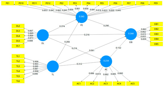 Before conducting the pilot study, we contacted the human resource managers from five manufacturing firms that are implementing digital transformation in the Shandong province of China and then asked whether their firms were willing to participate in this survey. After obtaining approval from two of the firms, each manager introduced an employee from the human resource management department to assist in the survey. To carry out the work efficiently, two research assistants were employed to distribute and collect questionnaires within the firms. Before filling out the questionnaire, all participants were informed about the purpose of the study, that participation is entirely voluntary, and that personal information would be strictly protected. The participants were required to complete the questionnaire within 15 min. Upon completing the questionnaire, the participants sealed it in an envelope and returned it to the assistant. The pilot study was conducted in November 2022 and lasted for a week. In the pilot study, 175 data points were collected with 129 usable questionnaires (a response rate of approximately 73.71%). As a result of the pilot test, considering that the value of “Cronbach’s Alpha if Item Deleted” was higher than the value of “Cronbach’s alpha”, we deleted one item of digital leadership and one item of transformational leadership to make items fit in a scale [167]. Moreover, one item of employee innovative behavior, one item of affective commitment, and three items of proactive personality were deleted because factor loading was below 0.60. The final questionnaire contained a total of 40 items.