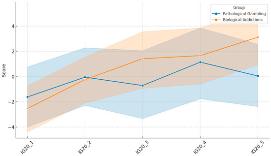 To assess the more dynamic dimension of decision-making, that is, the decision-making capacity in situ, the prominent IGT was used. As can also be seen in Table 1, both groups (pathological gambling and biological addictions) had similar decision-making capacities, with total averages of −1.19 and 3.41, respectively. Likewise, their learning curves (see Figure 2) did not differ in a statistically significant way, revealing similar learning during the task.