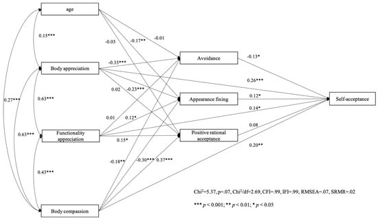 Higher body appreciation, functionality appreciation and body compassion were hypothesized to be associated with higher levels of positive rational acceptance and lower levels of avoidance and appearance fixing.