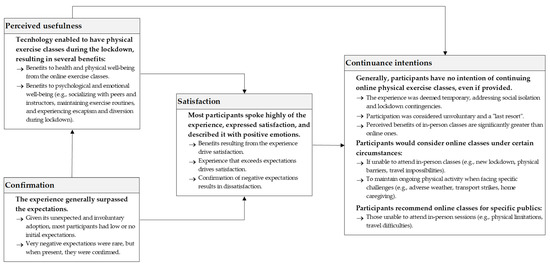 In line with the theoretical underpinnings [17,18], this study confirmed that perceived usefulness and confirmation determine satisfaction, providing additional evidence on the adequacy of ECM to understand continuance intentions. Most participants shared positive experiences with online physical exercise classes, attesting to their satisfaction. This fact was primarily attributed to the usefulness of these classes in overcoming limitations imposed during the pandemic. Furthermore, satisfaction correlated with the confirmation of initial expectations, even among individuals who had very negative initial expectations and confirmed them during the experience. Hence, the basic relationships proposed by ECM [17] between perceived usefulness, confirmation, and satisfaction provide a relevant lens to analyze the participants’ experience with online physical exercise classes.