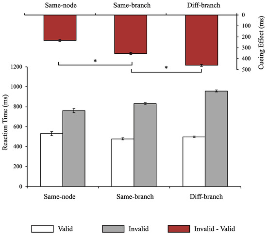 Results of Experiment 1. The histogram containing white and gray columns at the bottom is the reaction time under different conditions, and the histogram containing red columns at the top is the cueing effect under different conditions. Error bars represent SEM. Asterisks (*) indicate p-values of statistical test < 0.05.