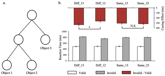 Hierarchical structure and results of Experiment 2. (a) The hierarchical structure with 3 objects used in Experiment 2. MGD between object 1 and object 2 was 2, and the MGD between object 1 and object 3 was identical to that between object 2 and object 3, being 3. (b) Results of Experiment 3. The histogram containing white and gray columns at the bottom is the reaction time under different conditions, and the histogram containing red columns at the top is the cueing effect under different conditions. Error bars represent SEM. Asterisks (*) indicate p-values of statistical tests < 0.05. N.S is the abbreviation of non-significant.