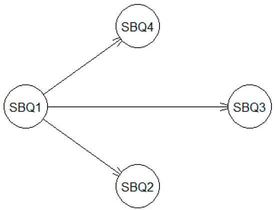 The Bayesian network uses Bayes’ theorem (conditional probability theorem) to define a probabilistic model on a random set of variables (also known as nodes) and the dependence relationships between them []. The modeling uses a directed acyclic graph (DAG) to represent the model network structure. For example, the DAG in Figure 1 shows the dependence relationships linking four variables of the SBQ-R, labeled after the item numbers (SBQ1, SBQ2, SBQ3 and SBQ4). Direct dependency between two nodes, such as SBQ-R Item 4, depends on SBQ-R Item 1, represented by an arc pointing in one direction from one node to another (i.e., SBQ1 → SBQ4). The node at the beginning of the arc (i.e., where the arrow points from) is known as the parent node (e.g., SBQ-R Item 1 in this example); the node at the end of the arc (i.e., where the arrow points to) is known as a child node (e.g., SBQ-R Item 4 in this example). More precisely, DAG is acyclic because its arcs are not allowed to have any directed cycle, starting and ending at the same node after a sequence of arcs (e.g., SBQ1 → … → SBQ1).