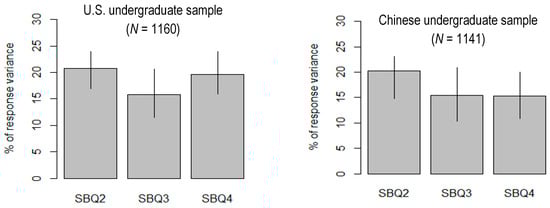 Descriptive statistics for the SBQ-R item and total scale scores are provided in Table 1. The internal consistency reliability of the SBQ-R total scores, estimated by Bayesian coefficient-omega and Bayesian coefficient-alpha, were adequate. In the U.S. undergraduate sample (N = 1160): Bayesian-ω = 0.854 (95% CI = 0.840, 0.868) and coefficient-α = 0.829 (95% CI = 0.815, 0.842). In the Chinese undergraduate sample (N = 1141): Bayesian-ω = 0.780 (95% CI = 0.758, 0.801) and coefficient-α = 0.753 (95% CI = 0.733, 0.773).