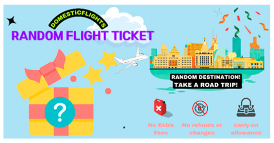Next, in an ostensibly separate task, participants in both conditions viewed a 24-s video introducing a random flight ticket. This unskippable video explained that the product features a non-refundable flight ticket at $13, which includes one-way airfare for a single person to a random domestic destination, with a maximum carry-on baggage allowance of 7 kg. The video was followed by a print advertisement summarizing the key contents of the video (Figure 2). After watching the video and seeing the print advertisement, participants were asked to rate their purchase intention for the random flight ticket. Respondents reacted to items such as “The random flight ticket is a suitable option for me” and “I would like to purchase the random flight ticket” on a seven-point scale (1 = “strongly disagree”, and 7 = “strongly agree”). The Cronbach’s α was 0.935. They also reported how much they appreciated the uncertainty embedded in the random flight ticket, using a seven-point scale (1 = “strongly disagree” and 7 = “strongly agree”). Items were adapted from Ketelaar and Van’T and Thorbjornsen and Buijzen [18], and included items like “I like the fact that this random flight ticket leaves me something to guess about”, “I think it’s interesting that this random flight ticket doesn’t reveal everything”, and” Not knowing the destination in a random flight ticket is exciting to me”. The Cronbach’s α of this scale was 0.847. Finally, participants provided demographic information (e.g., gender, age, and purchase experience). The demographic variables did not predict significant variance in the dependent variable (nor did they interact with any other independent variable to predict the dependent variable).