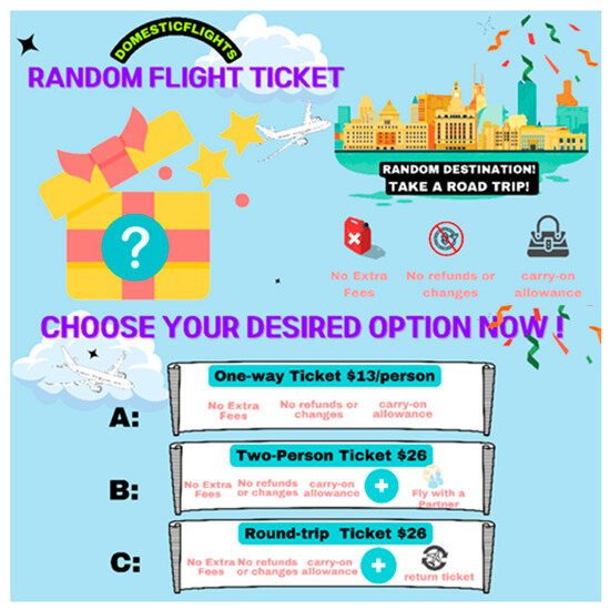 Participants were randomly assigned to one of the four conditions created by crossing personal control factor (high vs. low) and choice availability factor (choice vs. no choice). All procedures remained identical to those in Study 1, with the exception that participants in the choice condition watched a modified advertisement for the random flight ticket. The advertisement included the same 24 s segment used in Study 1, followed by an additional 8 s segment. This extended segment explained that consumers had the option to choose from three ticketing options: a $13 one-way ticket, a $26 one-way ticket for two individuals, or a $26 round-trip ticket. Subsequently, participants were presented with a print advertisement summarizing the key points of the video (Figure 3). Participants in the no-choice condition viewed the exact same advertisement as those in Study 1. Upon completing the same series of questions measuring personal control, appreciation of uncertainty, and purchase intention as in Study 1, all participants were asked to answer manipulation check questions regarding choice availability.