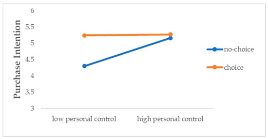 We conducted a two-way ANOVA with personal control, choice availability, and their interaction as independent variables and purchase intention of random flight ticket as the dependent variable. The results revealed a significant main effect of both personal control (F (1, 403) = 18.78, p < 0.00, ⴄ2p = 0.045) and choice availability (F (1, 403) = 26.03, p < 0.00, ⴄ2p = 0.061). More importantly, these effects were qualified by a significant interaction between personal control and choice availability (F (1, 403) = 15.69, p < 0.00, ⴄ2p = 0.037). As shown in Figure 4, in the no-choice condition, which was the exact same setting as Study 1, the findings from Study 1 were replicated. That is, participants in the high (vs. low) personal control condition reported a greater purchase intention of the random flight ticket (Mhigh = 5.16, Mlow = 4.30, p < 0.00). However, in the choice condition, there were non-significant differences between participants in the low versus high personal control conditions (Mhigh = 5.27, Mlow = 5.24, p = 0.794). Additionally, comparison between no-choice and choice condition revealed that, when choice was made available, purchase intentions significantly and statistically increased for participants in the low personal control condition (Mno-choice = 4.30, Mchoice = 5.24, p < 0.00).