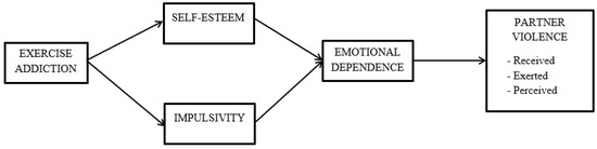 Therefore, the question arises as to whether self-esteem, impulsivity, and emotional dependence influence the relationship between exercise addiction and intimate partner violence. This is posed because emotional dependence plays a role in the persistence of romantic relationships, and in some studies, it acts as a mediator between certain psychological variables and violence [33,42,43,48]. Although there is evidence of a relationship between emotional dependence and addictions, research on emotional dependence and exercise addiction has not yet been conducted [49]. Similarly, low self-esteem and high impulsivity have been implicated in violent relationships and are, in turn, related to emotional dependence. Therefore, the proposed hypothesis is that impulsivity and self-esteem will serve as the first parallel mediators, while emotional dependence will serve as a second mediator in the relationship between exercise addiction and intimate partner violence.