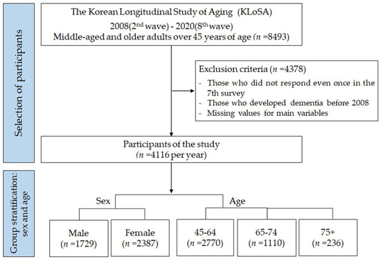 The Korean Longitudinal Study of Aging (KLoSA), conducted by the Korea Labor Institute since 2006, is a nationally representative longitudinal survey of individuals aged 45 years and older. The KLoSA has accumulated basic data through various interdisciplinary studies, measuring and identifying biological phenomena (physical and mental health), in addition to population, social, economic, and psychological phenomena in middle-aged and older adults for effective policy establishment and academic research. This study used the second- to eighth-wave data of the KLoSA, including 4116 people (28,812 cases) over 45 years old who answered related questions every year between 2008 and 2020 (Figure 1). The minimum sample size obtained using the G*POWER 3.1.9.7 (33) program was 992.