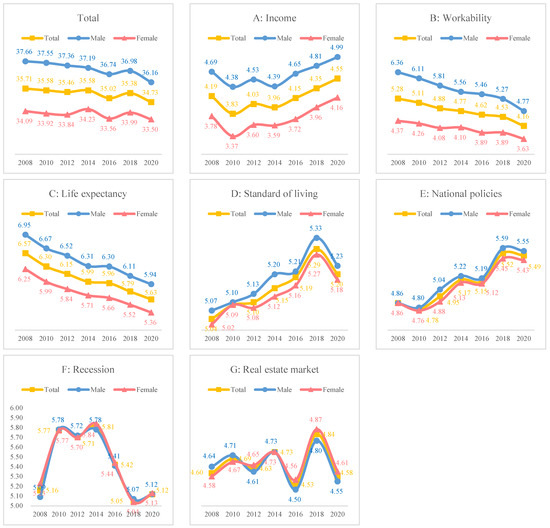 Trend of the seven domains of subjective expectation of the future by sex from 2008 to 2020.