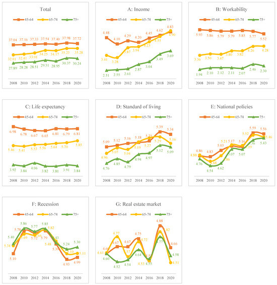 Figure 3 depicts the trends in the seven domains of subjective expectations by age group. The 45–64 years age group showed the highest level of subjective expectancy in the seven subdomains, followed by the 65–74 years age group and the 75 years or over group. From 2008 to 2020, the subjective expectation of the 45–64 year age group was stable, but that of the 65–74 and 75 or over age groups increased. As for the seven subdomains, expectations of income (A), standard of living (D), and national policies (E) increased, whereas expectations of work and life expectancy (C) remained stable. The expectation of a recession (F) increased until 2014, followed by a decline. Expectations of the real estate market (G) repeatedly increased and decreased.