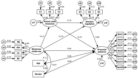 To analyze the structural equation model, AMOS 26.0 was employed to validate the mediating roles of parent–child closeness and emotion regulation. We implemented a bias-corrected confidence interval Bootstrap test for examining the model paths. This test involved 5000 resamples and set 95% confidence intervals, ensuring robustness in our findings. In line with the guidelines suggested by Little et al. [] and Rogers and Schmitt [] for item parceling in structural modeling, we adopted specific approaches for different scales. For the Electronic Media Use questionnaire, which contains multiple subscales, we used isolated parceling to combine these subscales into a single indicator. Conversely, a factorial algorithm approach was applied for scales with a single dimension, such as the parent–child closeness and emotion regulation subscales. Given the limited number of items in the prosocial behavior subscale, we opted not to employ the parceling strategy for this measure.