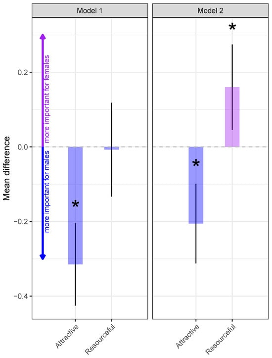 Comparison of men and women based on how important attractiveness and resourcefulness is for mate choice. Coefficients extracted from models 1 and 2 (see Table 3). * means statistical significance at alpha = 0.05.