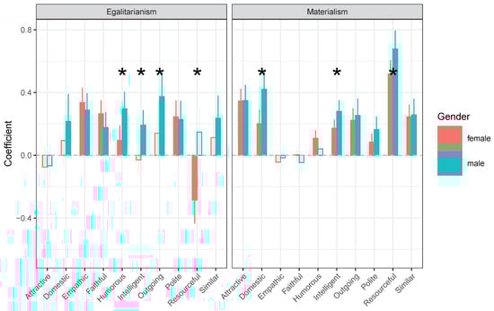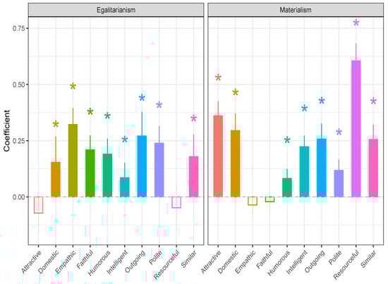 Effects of materialism and egalitarianism on mate choice criteria (extracted from structural model 2). Note: Empty bars reflect non-significant estimates. * means statistical significance at alpha = 0.05.