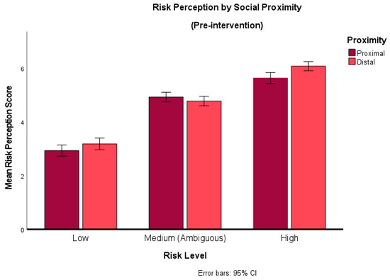 A paired sample t-test was conducted to understand this interaction further. The rating of risk for objectively low-risk scenarios was lower when they were socially proximal (M = 2.92) as opposed to socially distal (M = 3.18). This difference was found to be significant (t (149) = −2.21, p = 0.03, d = −0.18). Similarly, for high-risk scenarios, risk perceptions were on average lower when they were socially proximal (M = 5.59) compared to when they were socially distal (M = 6.01) (t (144) = −5.19, p < 0.001, d = −0.43). The reverse was found for ambiguous scenarios; when they involved socially proximal individuals, risk perceptions were marginally higher (M = 4.90) than for socially distal individuals (M = 4.73), and this difference was also significant (t (150) = 2.14, p = 0.03, d = 0.17). However, the effect sizes indicate that only the effect seen in the high-risk condition exceeded Cohen’s [33] convention for a small effect size, indicating that the differences in the other two conditions is negligible, even though they appear to be statistically significant. Therefore, we conclude that the only difference of note is for risk perceptions between proximal and distal scenarios in the high-risk condition.