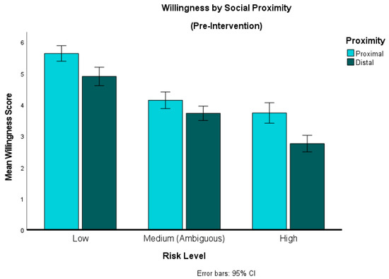 The repeated-measures ANOVA revealed a significant main effect of proximity (F(1, 137) = 81.79, p < 0.001, η2 = 0.37) and risk (F(1.68, 230.45) = 215.73, p < 0.001, η2 = 0.61). The ANOVA also revealed a significant interaction effect of proximity × risk (F(1.83, 250.15) = 6.07, p = 0.004, η2 = 0.042) (see Figure 2).