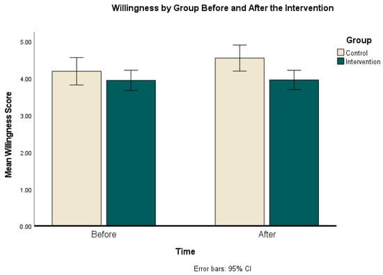 Behavioral willingness by group before the intervention (Time 1) and after (Time 2).