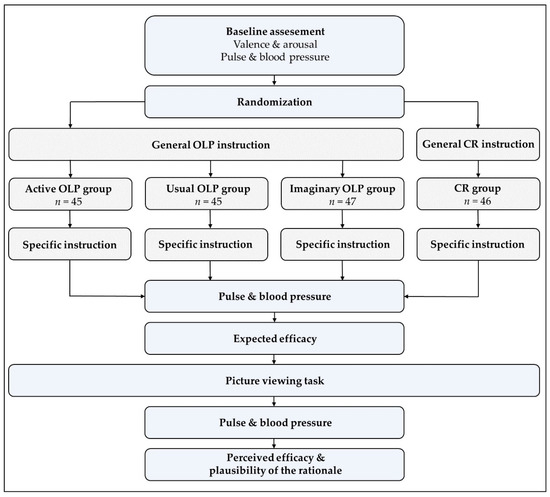 A total of 183 female participants (Mage = 23.4 years, SD = 4.11; 98% with a high school diploma, 52% psychology students) were randomly allocated (random number table) to one of four groups: active OLP (n = 45), usual OLP (n = 45), imaginary OLP (n = 47), or CR (n = 46). The groups did not differ in mean age (F(3, 176) = 1.37, p = 0.25). Exclusion criteria were self-reported diagnoses of mental disorders, neurological disorders, psychotropic medication, male gender, and age < 18 years. The sample was restricted to females because of sex differences in emotional reactivity to unpleasant images [19]. Moreover, research on deceptive placebos has indicated that males and females differ in how they respond to verbal placebo suggestions [20]. Finally, ref. [21] suggested that sex differences in placebo responses could be due to sex differences in the underlying physiological processes mediating placebo effects.