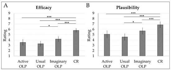 Mean ratings for efficacy (average of expected and perceived efficacy) in the four groups (A). Mean ratings for the plausibility of the rationale in the four groups (B). Error bars indicate 95% confidence intervals. * p < 0.05. *** p < 0.001.
