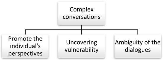 The findings have been organised under one main theme, “Complex Conversations”, which is divided into three related sub-themes: “Promote the individual’s perspectives”, “Uncovering vulnerability”, and “Ambiguity of the dialogues”. An overview of the theme and the sub-themes is presented in Figure 1.