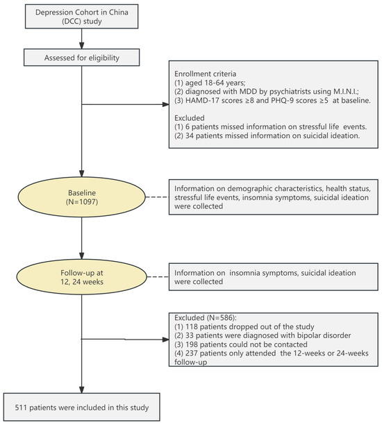 The study flow is depicted in Figure 1. At baseline, participants completed self-reported questionnaires concerning sociodemographic information, health related behaviors, mental health status, SLEs, SI, and insomnia symptoms. Participants were followed up at 12 and 24 weeks and the information about insomnia symptoms and SI was collected. Of the 1097 participants who completed the baseline survey, 118 participants dropped out of the study, 33 participants were diagnosed with bipolar disorder, 198 participants could not be contacted or have incomplete questionnaires, and 237 participants only attended the 12-week or 24-week follow-up, resulting in 511 participants being included in the final analysis.