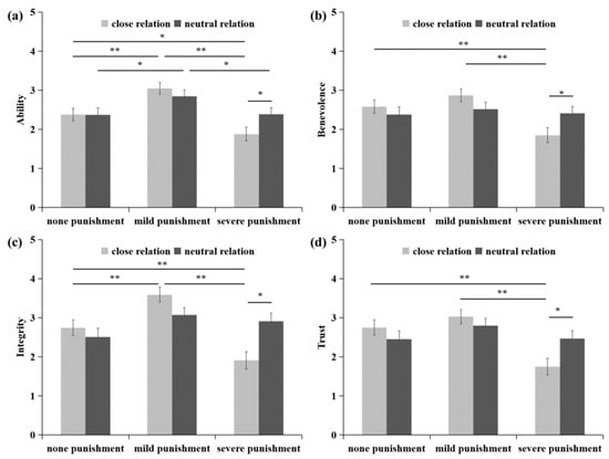 The effects of punishment on ratings of ability (a), benevolence (b), integrity (c), and trust (d); * p < 0.05, ** p < 0.01.