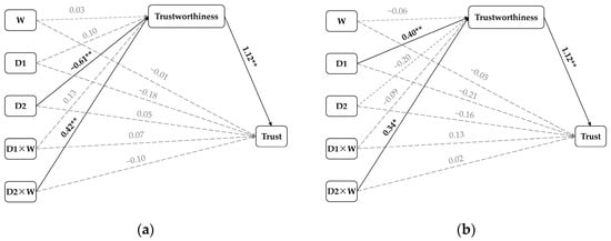 Mplus diagram for moderated mediation. (a) Testing whether trustworthiness mediates the effects of punishment versus no punishment (D1) or severe punishment versus mild punishment (D2) on trust and the moderating of group relationships (W). (b) Testing whether trustworthiness mediates the effects of mild punishment versus no punishment (D1) or severe punishment versus no punishment (D2) on trust and the moderating of group relationships (W). All the regression coefficients are standardised, * p < 0.05, ** p < 0.01.