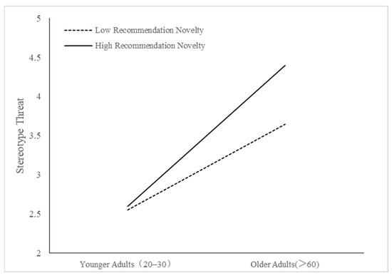 The influence of the social environment on consumer behavior in general is well demonstrated both in practice and empirically [64,65]. When older adults encounter younger social cues in their consumption environment, older consumers’ age-related identities may become more visible in their minds, and negative aging stereotypes may become more sensitive [31]. Because the presence of younger groups represented by younger cues may prompt older adults to make intergroup comparisons [66], they may become more aware of not being young enough to pose an age-related threat [23]. Prior research on stereotype threat suggests that this threat may induce older adults to adopt disengagement strategies to distance themselves from their age group as a way of self-protecting themselves from the threat of negative stereotypes of aging [67]. In addition, individuals also have engagement strategies to cope with stereotype threat, whereby, when faced with explicit factual statements or cues of age-related performance decline, participants sometimes behave in ways that are contrary to the expectations of stereotypical perceptions, to dispel the negative stereotypes that others have of them [26]. Amatulli et al.’s study confirmed that youthful social cues trigger aging-related identity threats in older consumers in immediate environments, yet they generate compensatory consumption behaviors and provide evidence that they prefer contemporary products to traditional ones when they feel young [31]. Based on these findings, we argue that older consumers who receive novel personalized recommendations of rejuvenation cues stimulate stereotypical perceptions of aging, but that they perceive themselves as more receptive to new recommended products or services when considering self-protective mechanisms, especially under the influence of access to new information that can be used for decision making [68]. Therefore, older consumers who are faced with the influence of novel recommendations will be more likely to accept the recommended product or service, showing a higher level of receptiveness to innovativeness, because it provides more comprehensive information about the purchase recommendation, and they can achieve the goal of moving away from the threat of stereotypes by accepting that type of product.