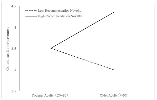 Nevertheless, individuals’ participatory strategies for coping with stereotype threat suggest that older adults’ cognitive deficits are manifested as reduced processing speed rather than diminished ability, that their ample knowledge and experience may offset cognitive deficits [89], and that it is the loss of social connections that is the primary factor in older adults’ limited appraisal of what is going on [34]. Reduced social connectedness means that older adults do not have the same easy access to information for decision-making as younger adults, leading to a common choice of avoidance strategies to deal with stereotype threats. The “human–computer interaction” created by personalized recommendation systems that meet predictions of individual preferences and interests compensates for older adults’ reduced social connections due to retirement and physical limitations. In addition, as a social context that influences older adults’ consumption in online shopping, recommendation novelty prepares older adults for potentially more comprehensive and popular product recommendations that are relevant to their interests and preferences, thus providing new information for purchase decisions, and they will adopt an engaged purchasing strategies in response to the threat of stereotyping. As predicted by social influence theory, older adults will be more interested in these novel products when they receive a comparable amount of advice as younger adults on in-demand product information [65]. From this perspective, while recommendation novelty leads to a higher level of conscious stereotype threat for cognitively older adults, they are also more likely to perceive themselves as having a higher level of receptiveness to innovativeness compared with cognitively younger adults. Because cognitively younger adults have higher levels of innovativeness themselves, they do not perceive additional innovativeness from novel recommendations. Thus, on the balance of the above arguments, we hypothesize the following: