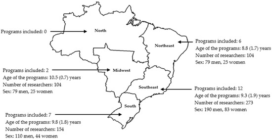 Twenty-seven graduate programs in physical education were analyzed in this study. The programs are located in different regions of Brazil: twelve are located in the Southeast, seven in the South, six in the Northeast, and two in the Midwest region of the country. There was no graduate program in physical education in the North region of Brazil that met the eligibility criteria. A total of 558 researchers were included. The majority were male (70.8%, p = 0.001), with a significant portion of faculty members affiliated with programs located in the Southeast region (48.9%, p = 0.001). Figure 1 provides detailed characteristics of the programs and researchers included in this study.