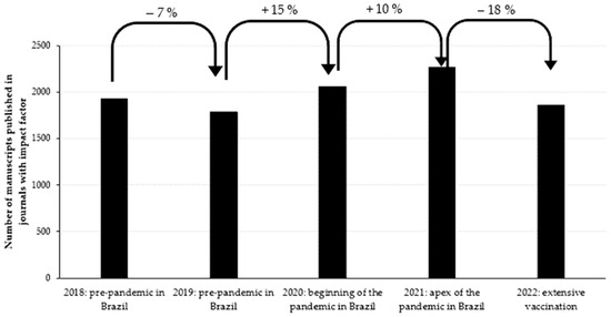 Figure 2 shows that the number of articles published in journals with impact factors declined between 2021 and 2022. This finding reinforces that the impact of COVID-19 on Brazilian researchers occurred in 2022. The impact factors of the journals in which the studies were published remained consistent over the years (Table 3). This demonstrates an effort of researchers to maintain the quality of their scientific production, even though the number of articles published in journals with impact factors has declined.