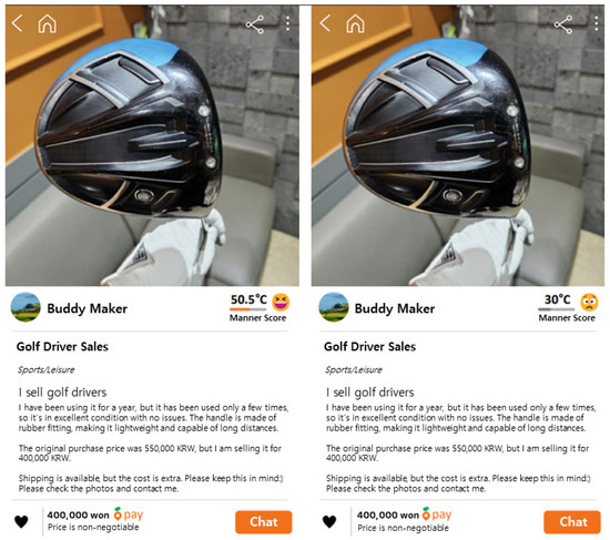 Virtual seller accounts and manner temperatures were manipulated to present information about golf drivers in a simulated Carrot Market platform scenario. Online transactions are characterized by trust-based transactions [35]. Specifically, sellers possess more information about the products than buyers due to their experience using the products, leading to information asymmetry between sellers and buyers [36]. Consequently, seller trust is crucial in the transaction process since buyers make purchase decisions solely based on the information provided by sellers. Carrot Market utilizes a composite indicator called ‘manner temperature’, derived from compliments, reviews, manner evaluations, and operator sanctions from buyers, to help buyers easily assess seller trust. Therefore, in this study, seller trust in Carrot Market was manipulated as high (50.5 °C) and low (30 °C). Additionally, during used transactions, sellers provide various information to prospective buyers (e.g., purchase price, quality condition, usage period, performance), and the seller’s price for the new product is often presented as well [8]. This information is provided to imply that the selling price is fair due to the seller’s high purchase price for the product. Therefore, in addition to the information provided by sellers to facilitate transaction completion, this study also presented textual information related to the purchase price, quality condition, and product performance of the selected product category, along with an image of the product.