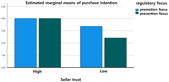 Further analysis of the interaction effect was visualized in Figure 3. The figure demonstrates that while there was no significant difference in purchase intention between promotion-focused and prevention-focused consumers when seller trust was high (t = −0.00, p > 0.05), there was a significant difference when seller trust was low (t = 4.23, p < 0.001). Specifically, consumers with a promotion focus showed higher purchase intention than those with a prevention focus when seller trust was low. Based on these results, Hypothesis 2-1 was rejected, and Hypothesis 2-2 was supported.