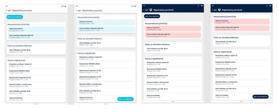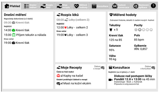 - Scenario/Task: To verify the feasibility of the tasks, the following features were tested: requesting a prescription for medication, making an appointment with a doctor, recording measurements, and setting medication reminders. The usability of the browsing application was verified by performing tasks such as “returning to the home screen” and “navigating across sections without using a menu”. The evaluation of the design patterns included the following: a dashboard with tiles, a list/detailed layout, tips displayed in the detailed view with options to collapse/expand and view more information, distraction-free task interactions within pop-up/modal dialogues, and overlays with guided instructions.