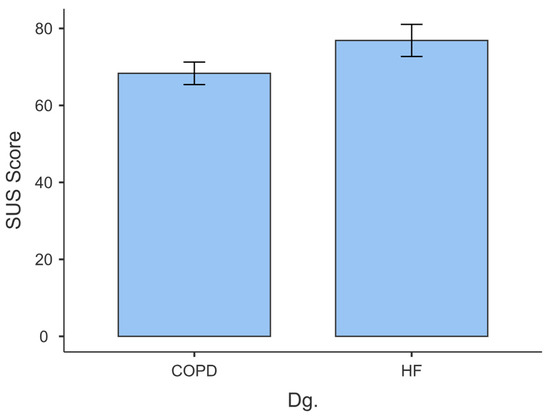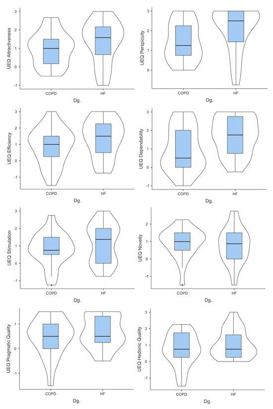 User experience was measured by the UEQ and SUS. An advantage of both tools is that there are available benchmarks. Nevertheless, they are not exclusively related to eHealth or mHealth solution. Hence, they can provide only a rule-of-thumb comparison against other available products or services. For UEQ, there are three distinctive groups, namely the general benchmark, business software, websites and web services. In the presented case, the general benchmark was applied. Unlike the BMQ, the UEQ results show that the perception of the digital solution was better among the HF cohort. The mean values for the pragmatic and hedonic qualities and overall are 0.66, 1.06, and 0.86, respectively. An above average result is acquired only in the hedonic quality scale. The pragmatic quality is bad in comparison to benchmark. The overall results for the HF cohort are below average. Though an improvement in NCD was observed in the COPD cohort, their perception of UX, as measured by the UEQ, is even worse than those of the HF cohort. The COPD cohort’s results for UEQ in terms of the pragmatic and hedonic qualities and overall are 0.48, 0.73, and 0.6, respectively. The pragmatic quality is observed to be bad and the hedonic quality as well as overall appraisal are below average. In that matter, it seems that the NCD change and UX, as measured by the UEQ, are detached.