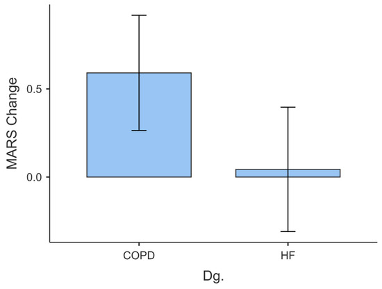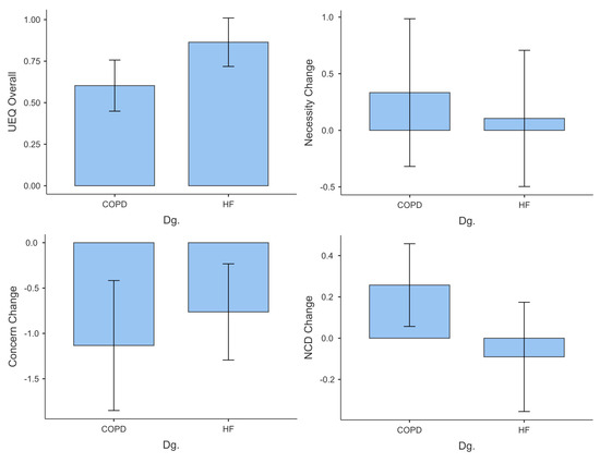 The HF and COPD groups reported similar changes in medication concerns, negative consequences, and overall user experience when using the system. This suggested that the system had a comparable effect on these aspects for both patient populations.