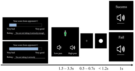 In Study 2, a manipulation of triggering was added. Specifically, in the modified two-stage (passive stage and active stage) competitive reaction time paradigm, the manipulation of high and low provocation in the passive stage remained unchanged. However, before the start of the active stage, participants were informed that during their previous game against opponent A in the previous stage, there was a bystander player (opponent C) who scored and evaluated their performance, as shown in Figure 4. The active stage involved two levels of triggering from the opponent, high trigger and low trigger, with the presentation order of high and low trigger being balanced across participants. In the high-trigger condition, opponent C would give the participant a lower score (2 out of 9) and send a negative evaluation (e.g., “You are not taking it seriously enough”). In the low-trigger condition, opponent C would give the participant a higher score (8 out of 9) and send a positive evaluation (e.g., “You are taking it seriously”) [29].