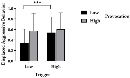 The results of a repeated measures analysis of variance using displaced aggression as the dependent variable revealed a significant main effect of provocation, F(1, 70) = 5.18, p = 0.03, η2 = 0.07. The proportion of aggression in the high-provocation condition (Mhigh = 0.59, SDhigh = 0.32) was significantly higher than in the low-provocation condition (Mlow = 0.45, SDlow = 0.30). There was a significant main effect of trigger, F(1, 70) = 16.51, p < 0.001, η2 = 0.19. The proportion of aggression in the high-trigger condition (Mhigh = 0.58, SDhigh = 0.31) was significantly higher than in the low-trigger condition (Mlow = 0.46, SDlow = 0.32). The interaction effect between provocation and trigger was significant, F(1, 70) = 8.66, p = 0.004, η2 = 0.11. For the low-provocation condition, the proportion of aggression in the high-trigger condition was significantly higher than in the low-trigger condition, F(1, 70) = 25.24, p < 0.001, η2 = 0.27, as shown in Figure 5.