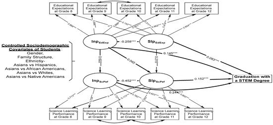 To test the above hypotheses, the sociodemographic variables of students’ gender, family composition, and ethnicity are controlled to preclude possible confounding effects in the modeling procedures. This is because female students are generally found to have higher educational motivation and academic performance than their male counterparts [18,35,56], although their different STEM intentions and enrolments in STEM majors reported by recent research indicate that female students are more fond of health-related and life science subjects while their male counterparts tend to be interested in physical and computer science [3,18,57]. In addition, students living with both their biological father and mother tend to have better educational expectations and academic achievement compared to their counterparts in other family structures [58,59]. In this study, student participants are classified into five ethnic groups that include Hispanics, African Americans, whites, Native Americans, and Asians, in which Asian students were set as the reference group due to their stronger educational drive and academic outperformance [60,61,62,63].