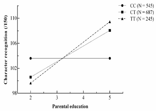 Plots of predicted values as a function of parental education under the strong differential susceptibility gene–environment model for character recognition.