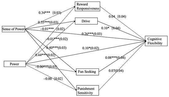 Looking at power from a structural perspective, reward responsiveness, drive, fun-seeking, and punishment sensitivity do not exhibit significant mediating effects between power and cognitive flexibility. On one hand, as an objective indicator, positional power may directly affect cognitive flexibility or do so through other unknown variables and psychological processes. Under certain circumstances, sense of power may predict individual attitudes and behavioral responses more effectively than power itself [2], which is evident in self-reported data. On the other hand, individuals with high power may make faster decisions and adapt to new situations due to having greater resources and autonomy, which are not dependent on responses to reward or drives for fun-seeking. The role of punishment sensitivity in affecting cognitive flexibility may be diminished or obscured by factors such as stress, anxiety, or resource scarcity [34,35], and future research could delve into the impact of potential factors like social support, socio-economic status, and cultural differences on the relationship between power and cognitive flexibility.