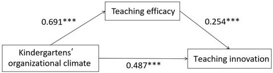 The results of this study showed that kindergartens’ organizational climate positively predicted teaching efficacy, that teaching efficacy positively predicted teaching innovation, and that teaching efficacy partially mediated the relationship between organizational climate and teaching innovation. The results validated Hypotheses 2 and 3.