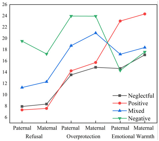To explore the latent categories of parental rearing styles, three parenting styles (rejection, emotional warmth, overprotection) were used as observed variables. The latent profiles of parental rearing styles were analyzed using one, two, three, and four latent class models. The fit results of the analysis model are shown in Table 2. Based on the LMR LR test, the three-class model is superior to the two-class model, and the two-class model is superior to the one-class model. However, comparing the three-class model and the four-class model, it was found that the three-class model actually combines the low negative–low positive and low negative–high positive classes into one class. Taking into account the fit information mentioned above, the four-class model was ultimately chosen as the final model for latent profile analysis. The four classes are positive (positive parenting from both parents, 48.97%), negative (negative parenting from both parents, 6.82%), mixed (medium positive/negative parenting from both parents, 19.42%) and neglectful (low positive and negative parenting from both parents, 24.79%) (Figure 2).