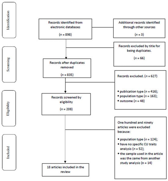 After analyzing the selected articles in full text, 15 were retained for review, and 190 were excluded for the following reasons: population type (n = 124; n = 55 refers to samples with juveniles who have engaged in various offending types without differentiation in JSOs or JGOs; n = 69 samples without the criteria (e.g., age, other diagnoses, sex)); have no specific CU traits’ analysis (n = 52); and the sample used in the article was the same from another study analysis (n = 14). In addition, three studies were included from the manual search. In total, this systematic review comprised 18 articles (see Figure 1). The methodological aspects (sample/instruments) and the main conclusions were extracted from each study.