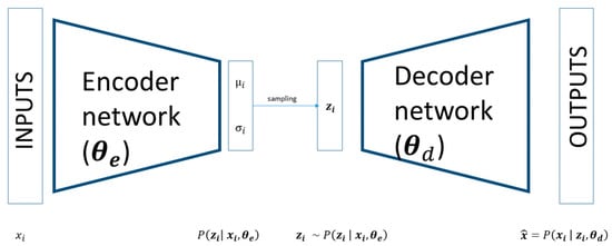 Variational autoencoder (VAE) [25] is a latent variable model that applies variational inference, i.e., maximizes the ELBO throughout artificial neural networks, making the problem differentiable for the backpropagation training. It is composed of two symmetrical neural networks, an encoder and a decoder, connected by a hidden layer that maps the inputs in a low-dimensional space, usually referred to as latent space. Differently from traditional autoencoders, which directly encode the inputs x into latent points in a deterministic way and then decode these points to reconstruct x, VAE is formed by a probabilistic encoder, defined by , that describes the distribution of the encoded variable given the input x. This process enables us to define a conditional model that describes how observed data depends on latent variables, as well as a prior density p(z) over the latent space.